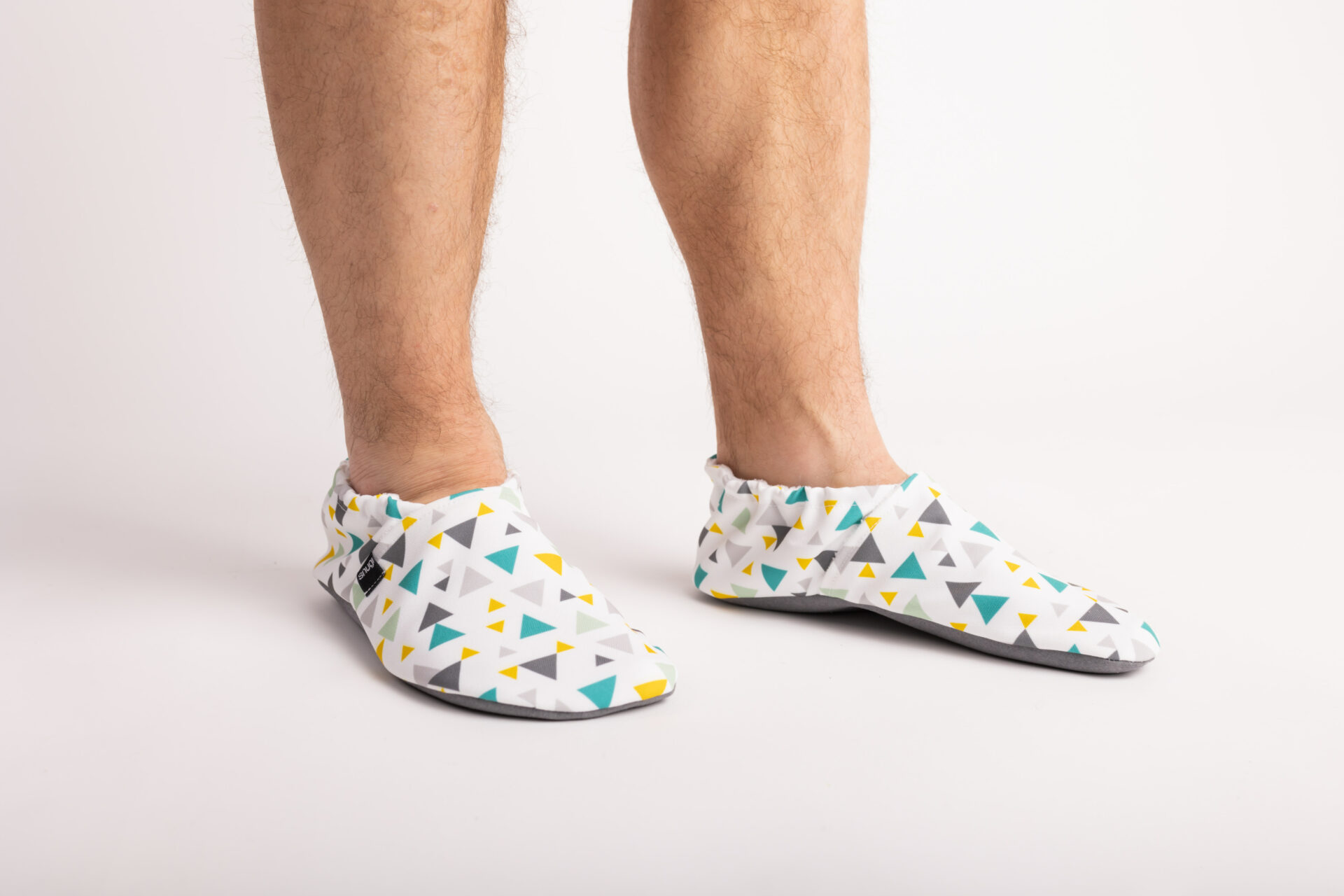 Colourful triangles on comfortable, soft and breathable slippers that are easy to wear and mimic barefoot walking.