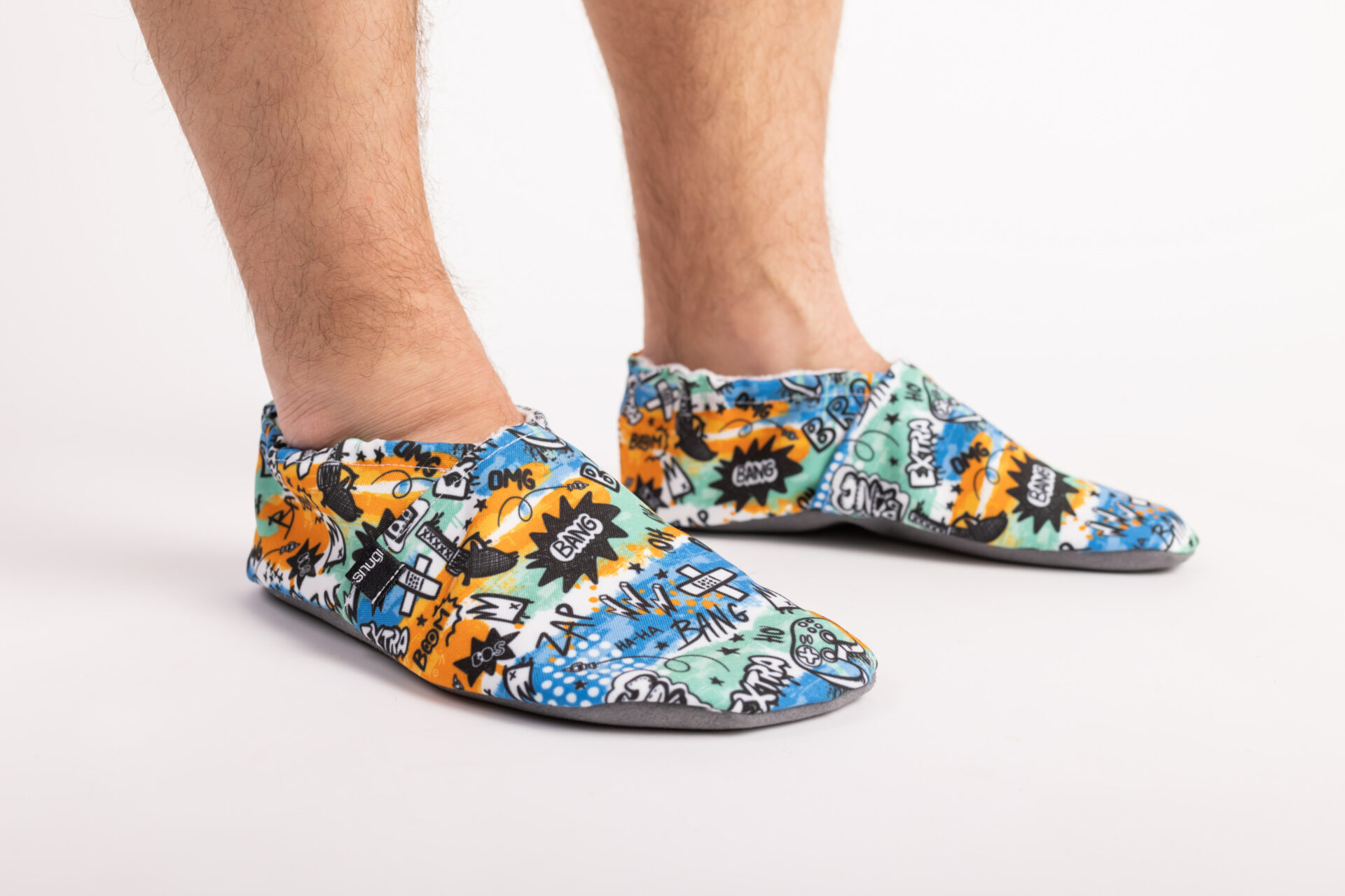 The slippers are handmade in Slovenia using materials certified Class 1 Oeko-Tex Standard 100, which means they are suitable for direct contact with sensitive skin.The outside of the slipper is made of a durable coloured fabric, while the inside is lined with smooth and flexible cotton velvet.The inner side of the sole is made of 2 mm foam and covered with a slightly furry fabric that ensures softness and full breathability in all seasons. The outer side of the sole can be made of either high-tech microfibre with non-slip silicone or Toughtek.