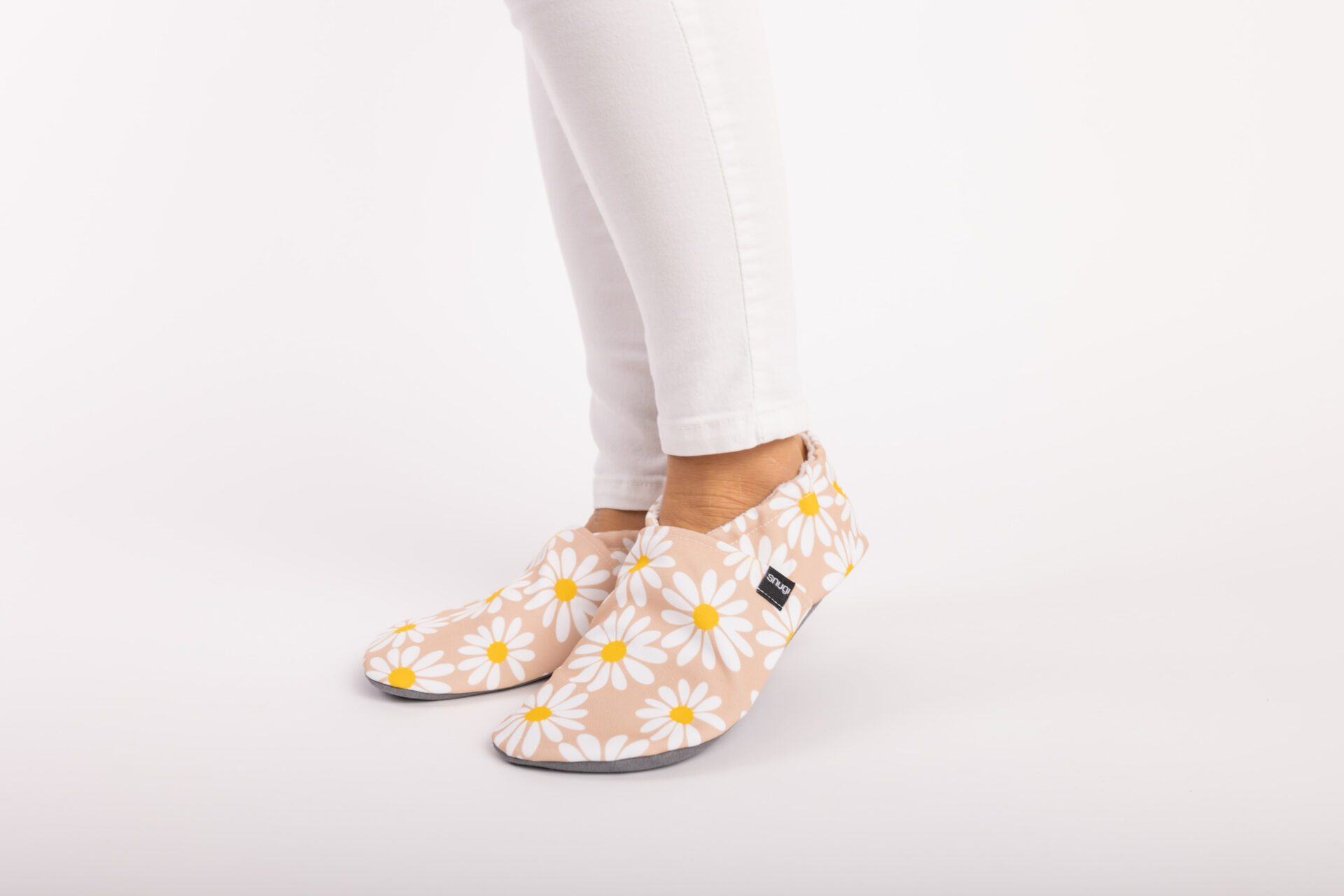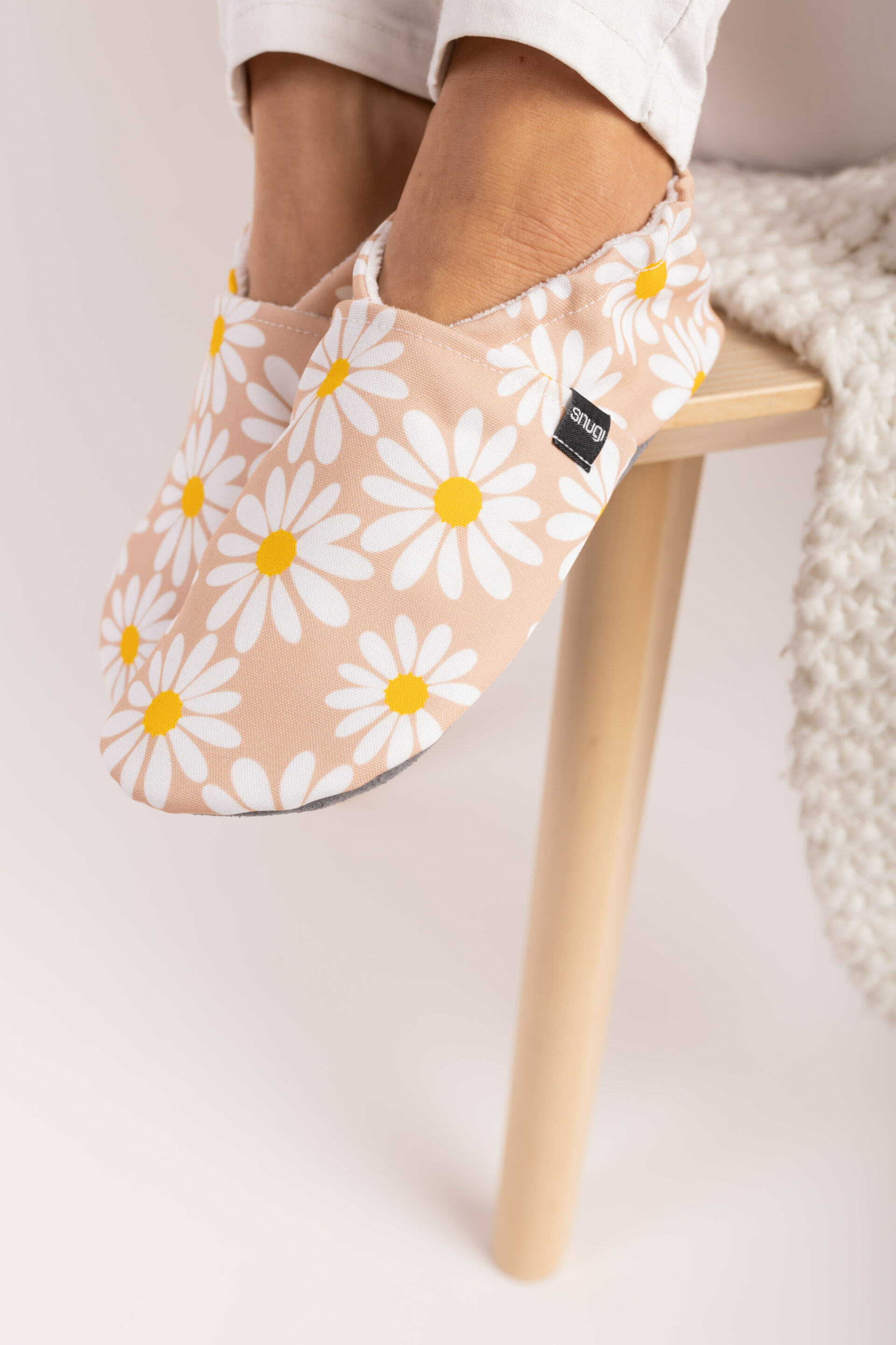 Simpatične tratinčice na nježnoj pozadini u boji marelice. Proljeće je na svakom koraku s našim udobnim, mekim, bosonogim papučama.