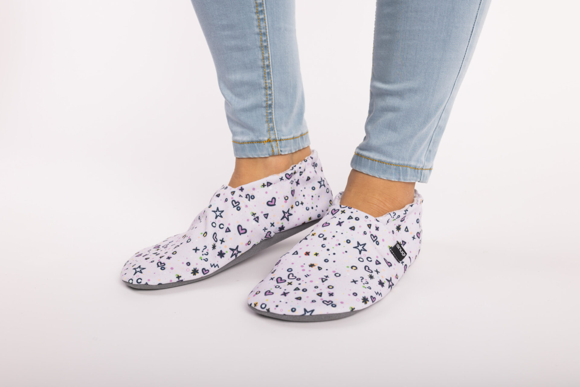 Živahni raznovrsni motivi na nježnoj ljubičastoj podlozi. Savršeno za svakoga tko traži udobnost, mekoću, lakoću i papuče koje ne izazivaju znojenje.