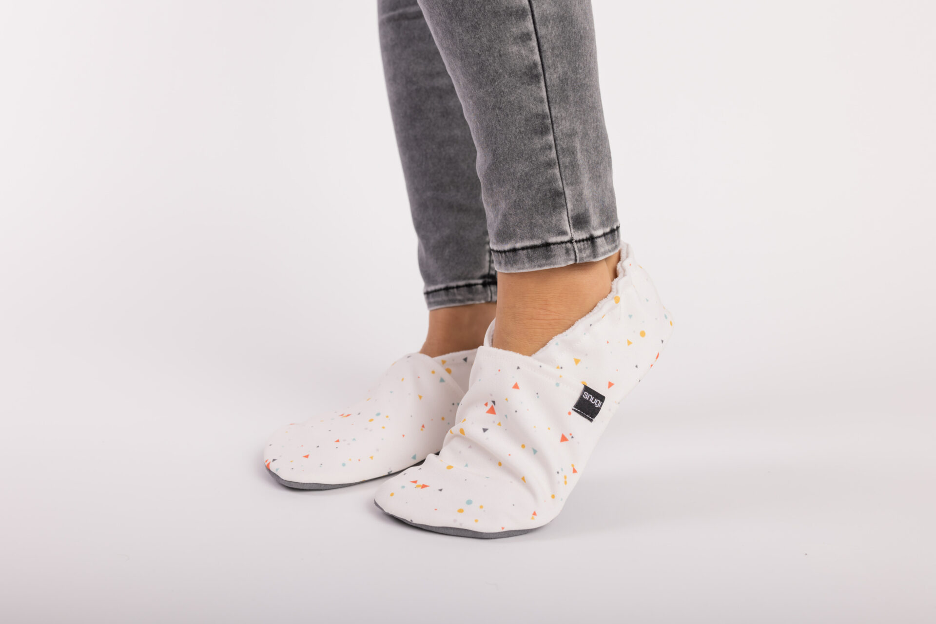 Sitni geometrijski oblici na elegantnoj bijeloj podlozi. Naše papuče su mekane, udobne i prozračne i najbolje predstavljaju bosonogo hodanje.