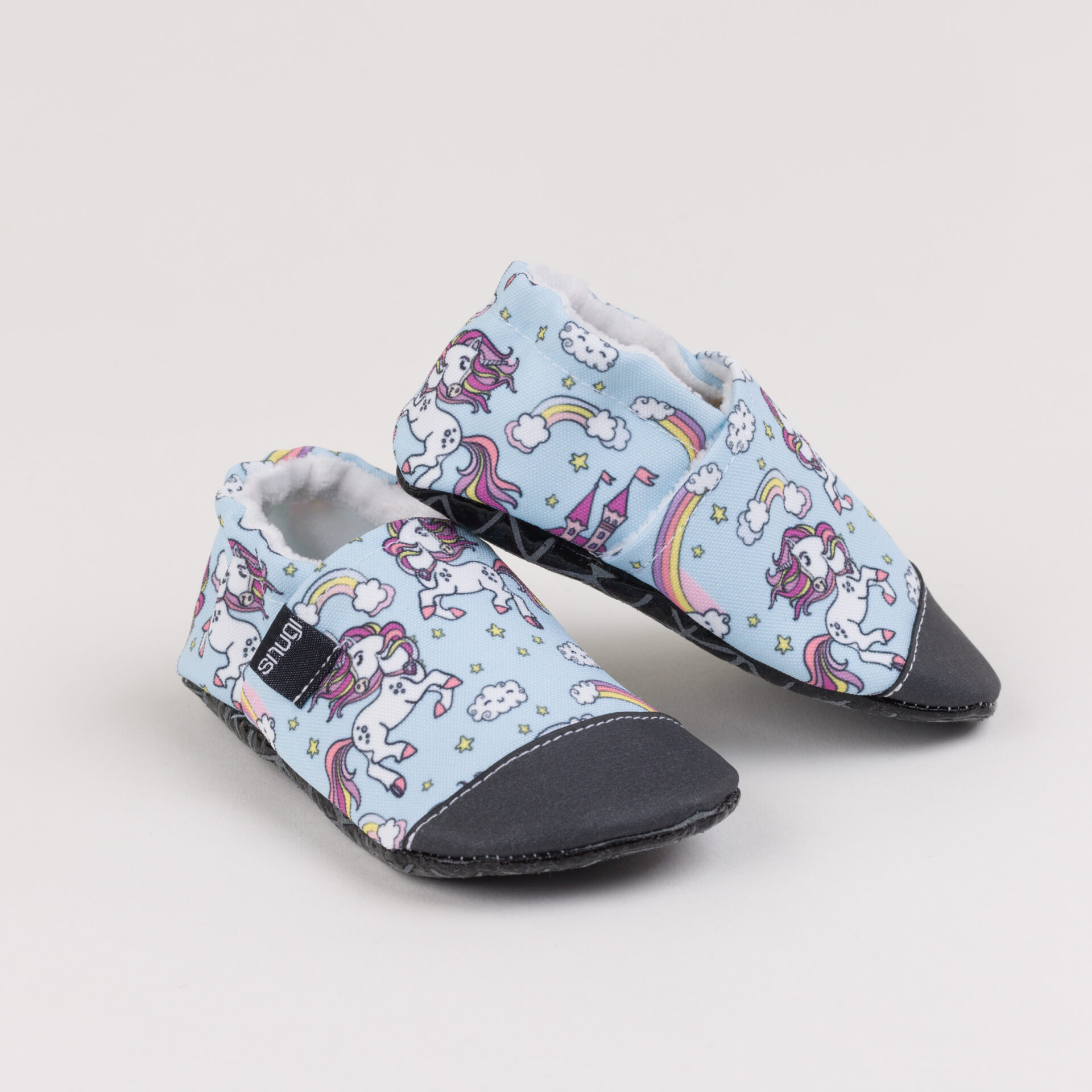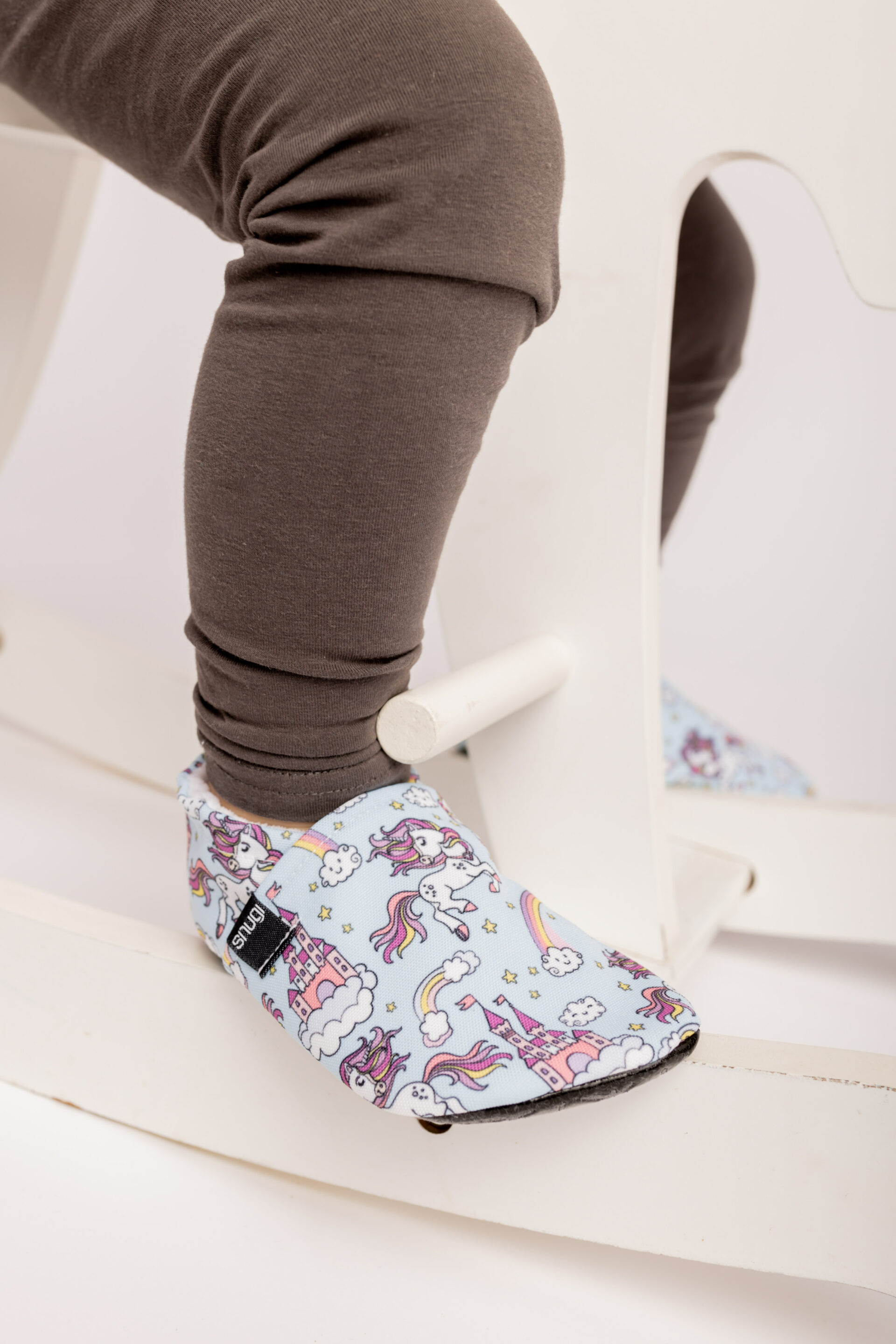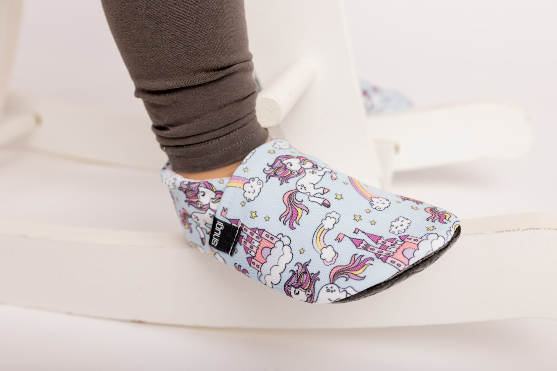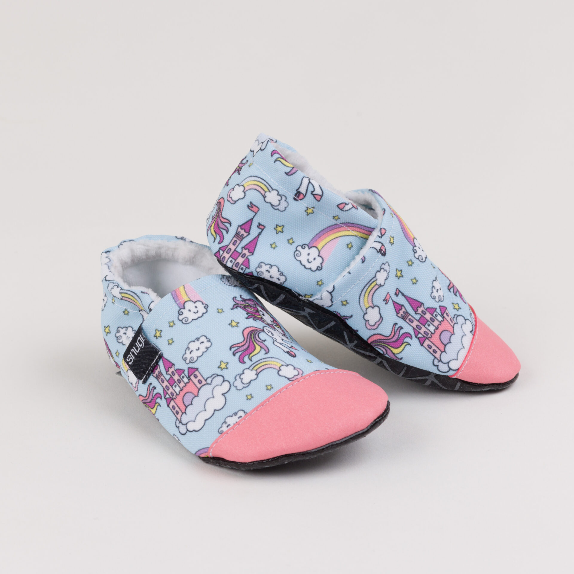 Bajkoviti uzorak s jednorozima i dvorcima. Naše dječje papuče su udobne, mekane i prozračne te najbolje predstavljaju bosonogo hodanje.