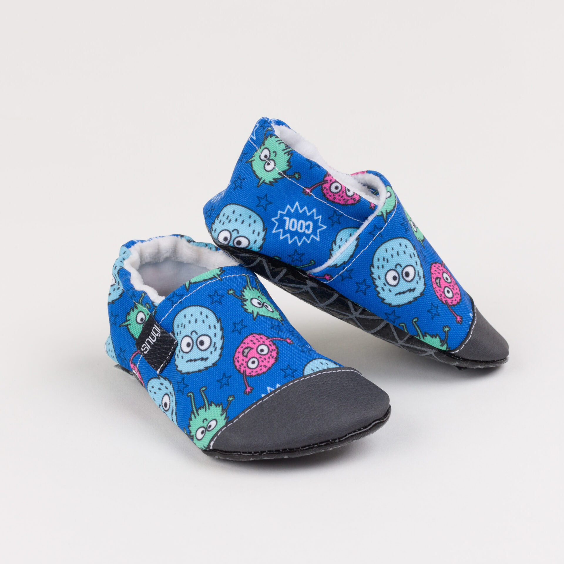 Mala simpatična čudovišta na udobnim, mekim i prozračnim dječjim papučama koje najbolje predstavljaju bosonogo hodanje.