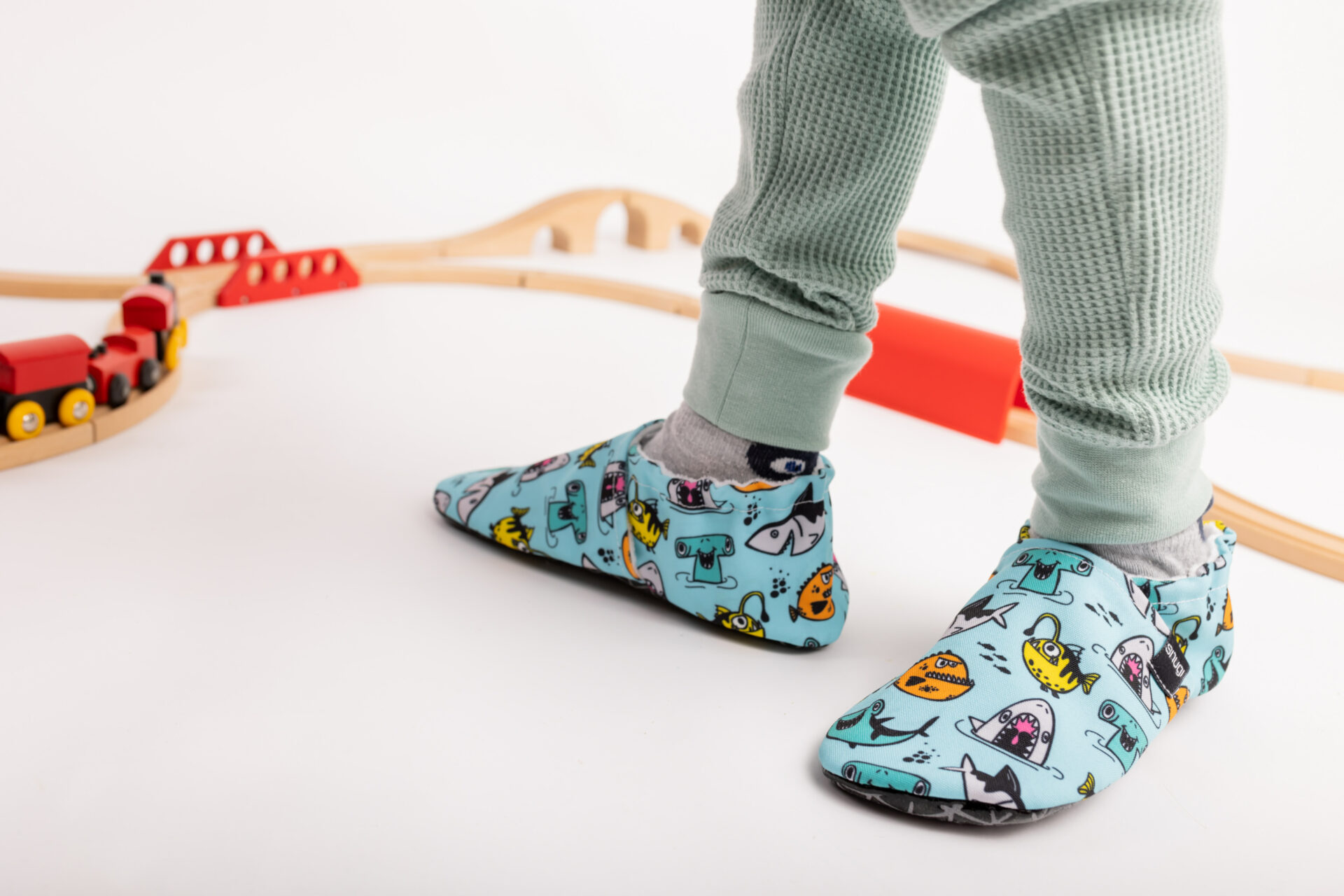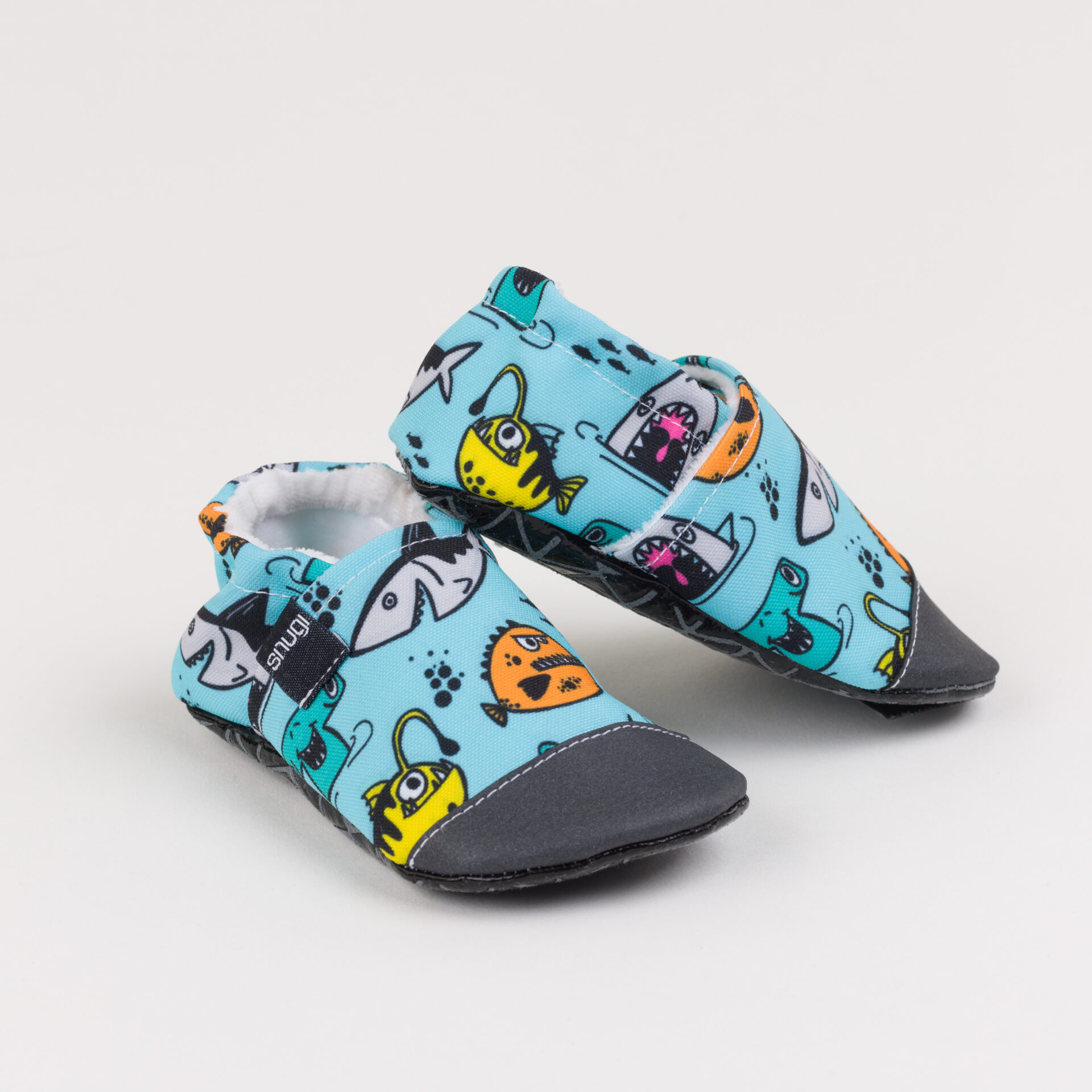 Zabavne pisane ribe na udobnih, mehkih in zračnih otroških copatih, ki so najboljši približek bosonogi hoji.
