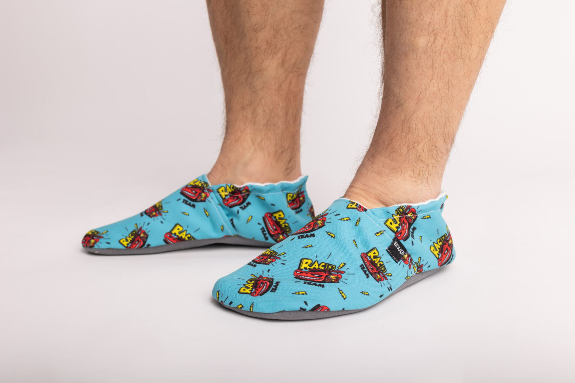 Zabavni motivi dirkalnika na modri osnovi. Naši copati posnemajo bosonogo hojo, ne povzročajo potenja, nudijo le udobje.