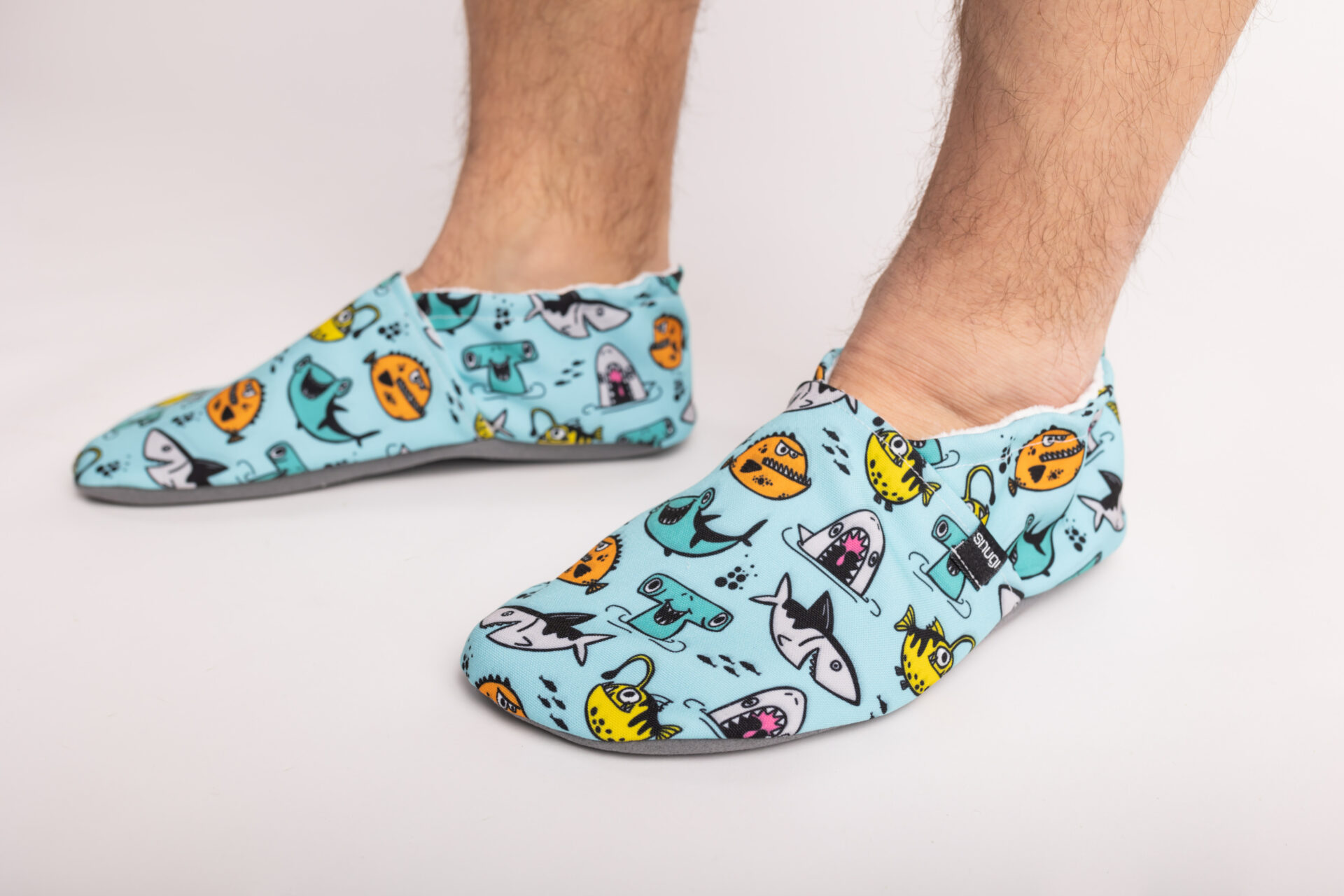 Ribe, morski psi in še marsikaj drugega plava na naših zabavnih morsko obarvanih bosonogih copatih, ki vam nudijo udobje in zaščito.