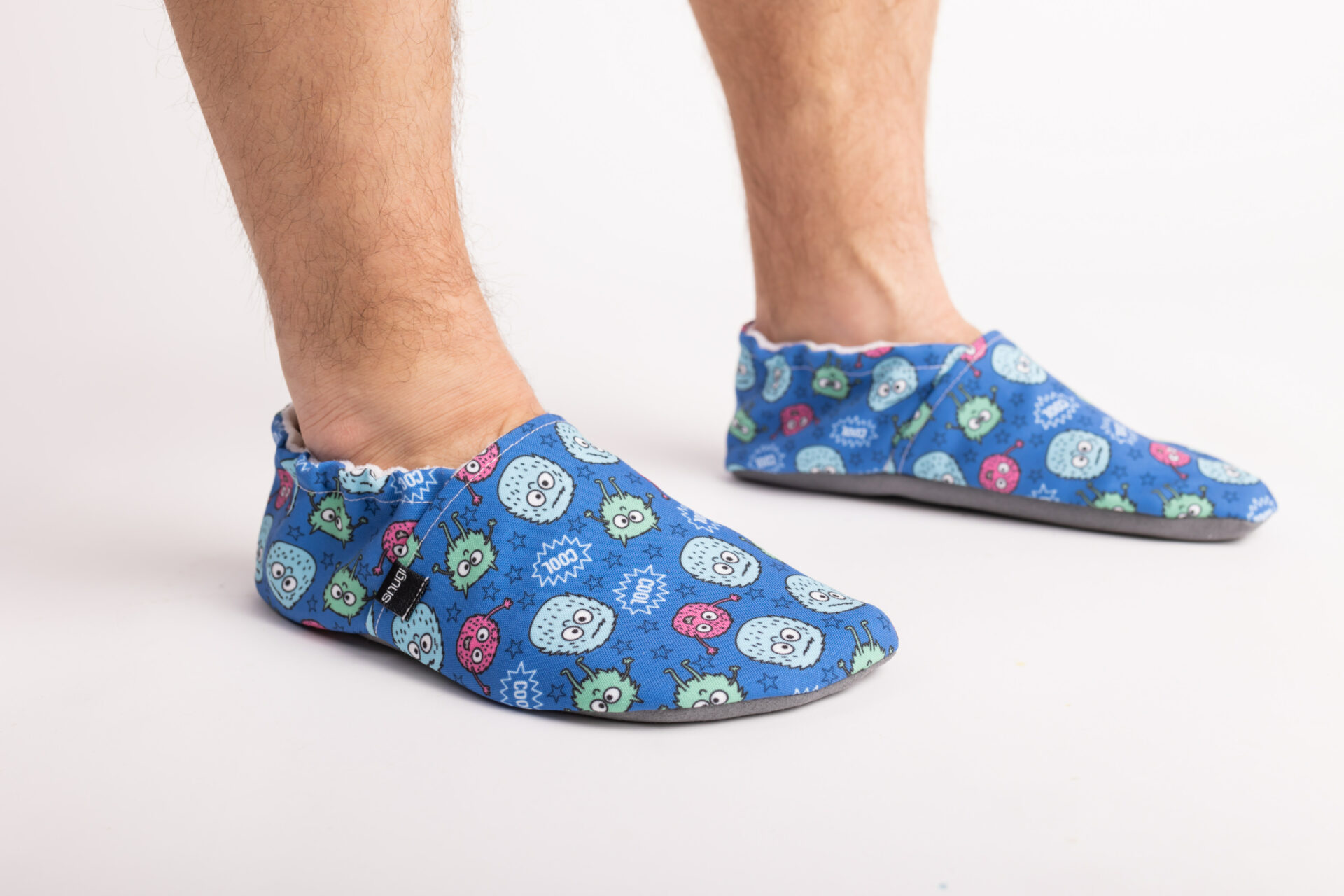 Majhne pošasti na čudoviti modri osnovi. Obujte jih in spoznajte, kako udobno in zračno je bosonoštvo z našimi copati.