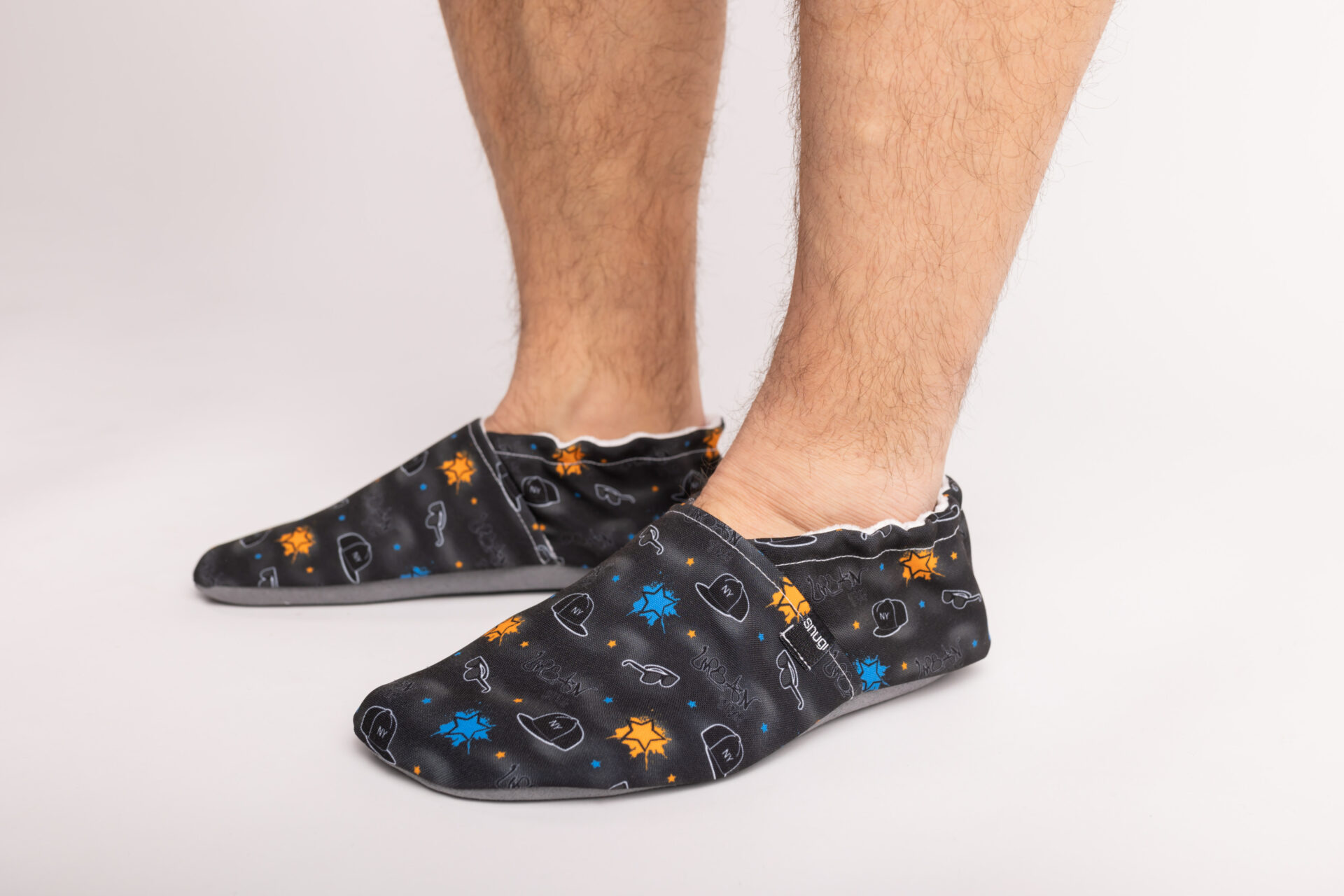 Zmagovalna kombinacija črne, rumene in modre na bosonogih copatih, ki zagotavljajo maksimalno udobje čez cel dan.