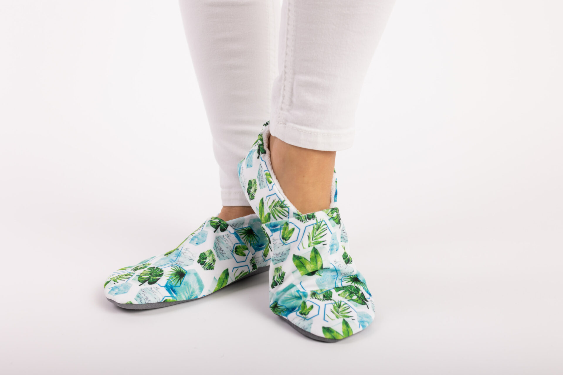 Tropsko listje na eksotično obarvanih copatih. Bodite pripravljeni na udobne, mehke in varne dogodivščine.