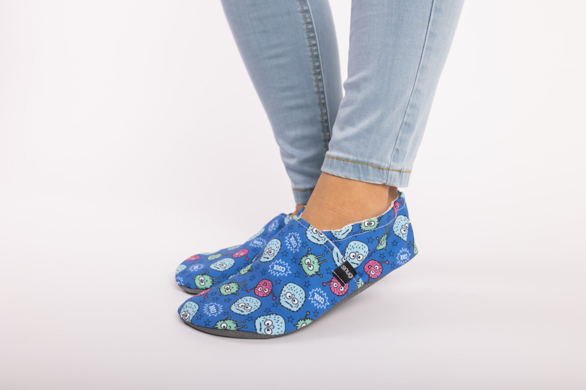 Majhne pošasti na čudoviti modri osnovi. Obujte jih in spoznajte, kako udobno in zračno je bosonoštvo z našimi copati.