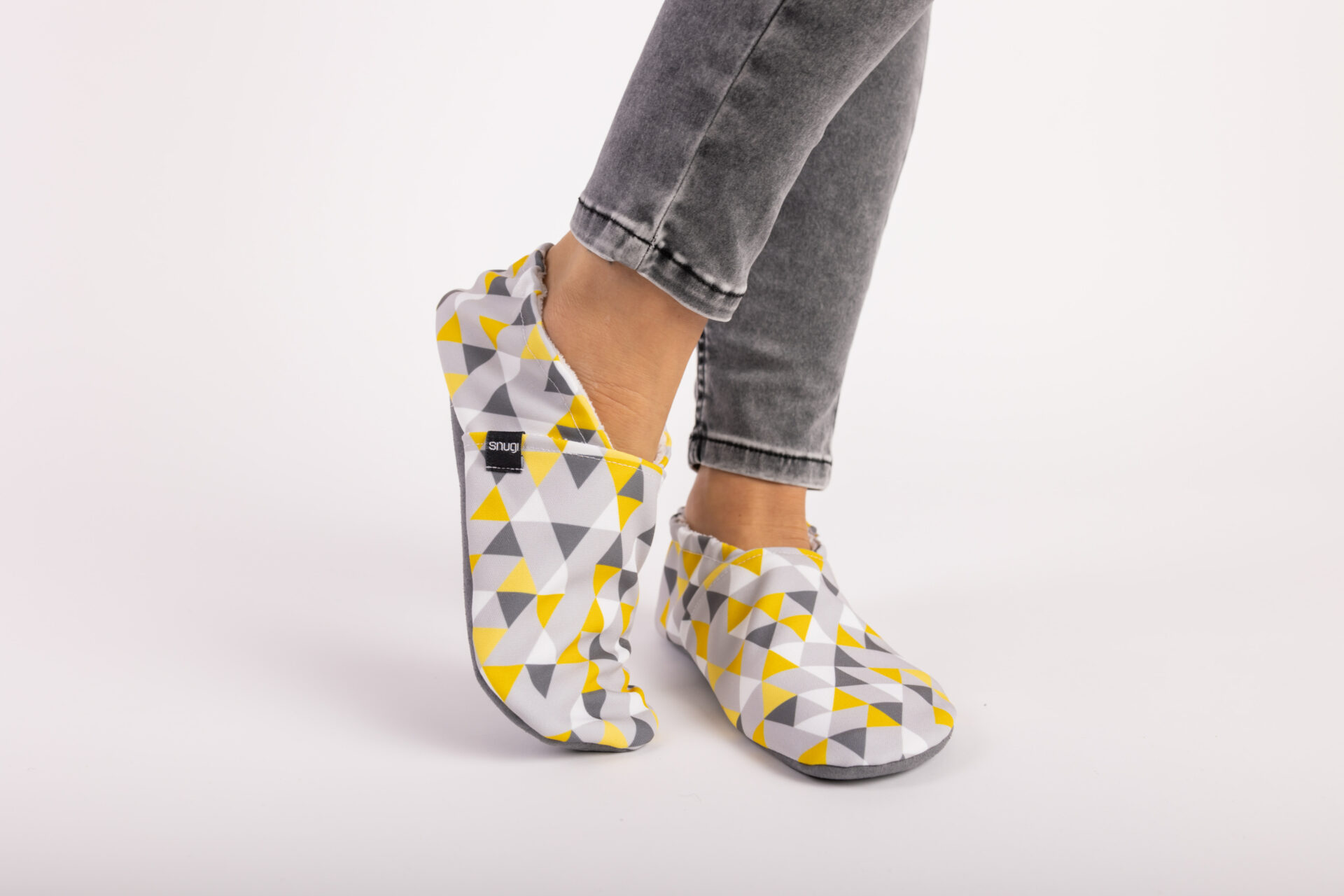 Mešanica trikotnikov v rumeni, bež in sivi. Naši copati so najboljši približek bosonogi hoji, ki ščiti stopalo in ne povzroča potenja.