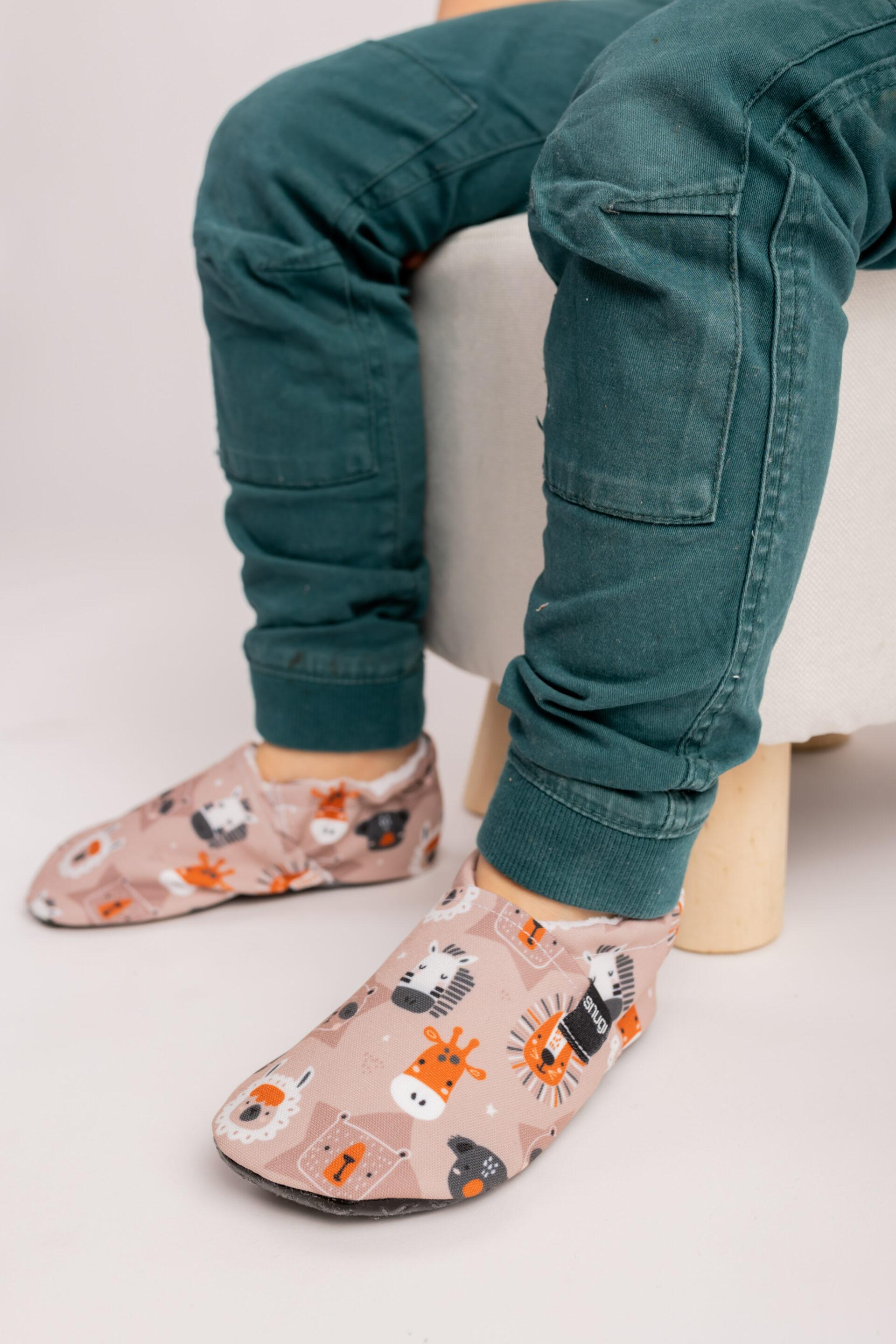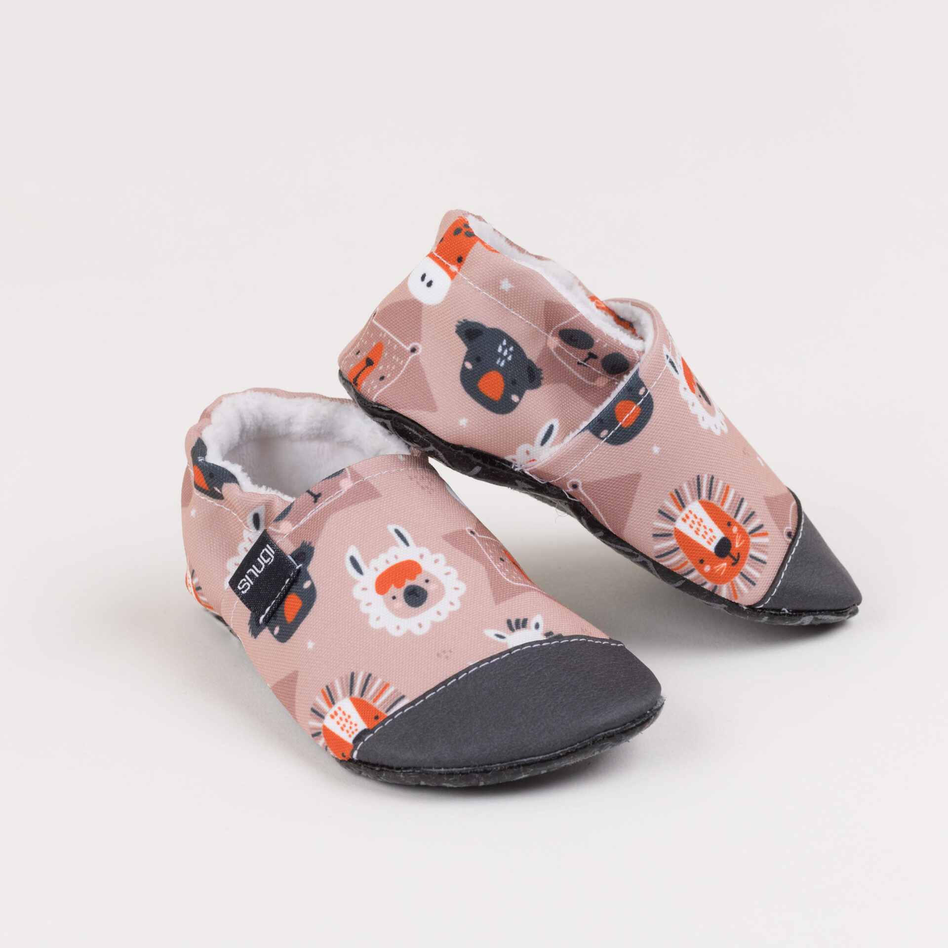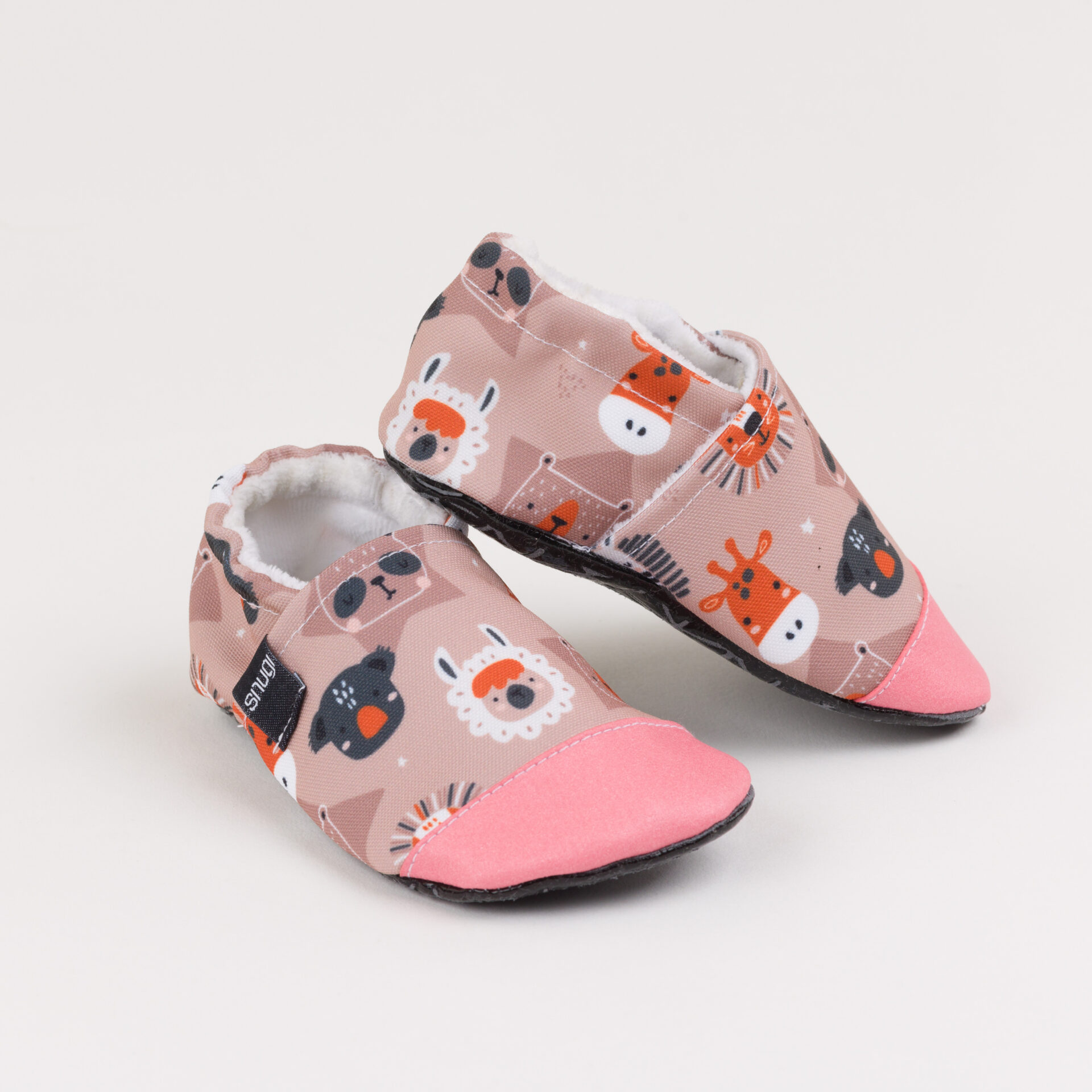 Krasne živali na nevtralnem ozadju, popolno za fantke in punčke. Naši otroški copati so udobni, mehki in zračni ter veljajo za najboljši približek bosi hoji.